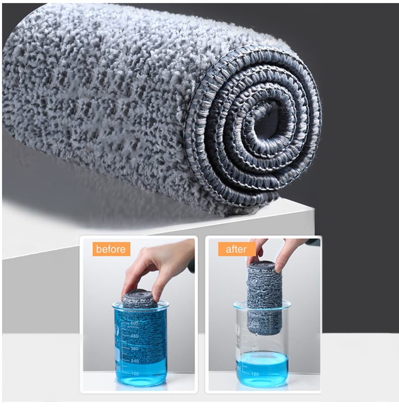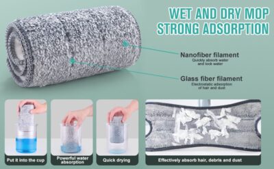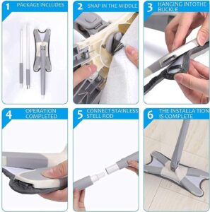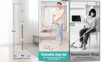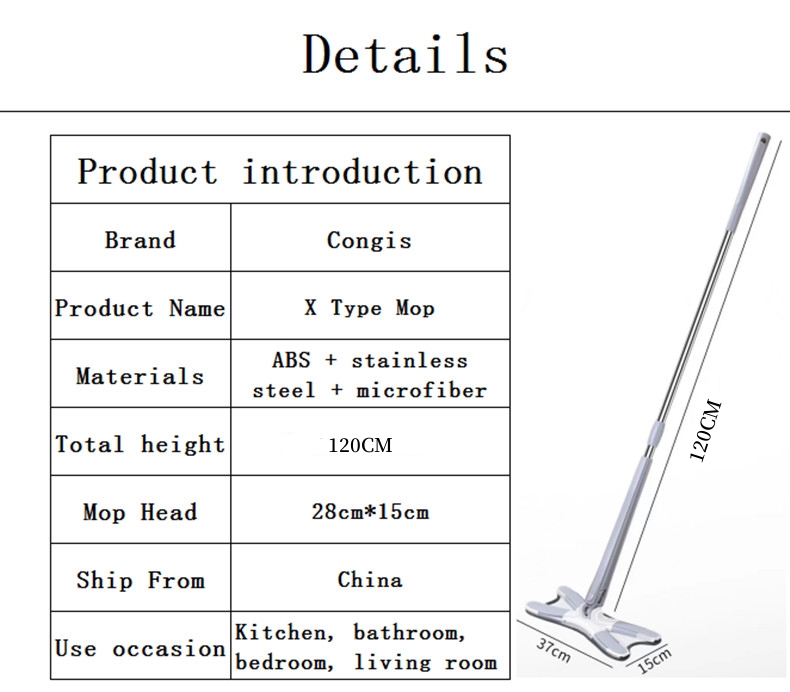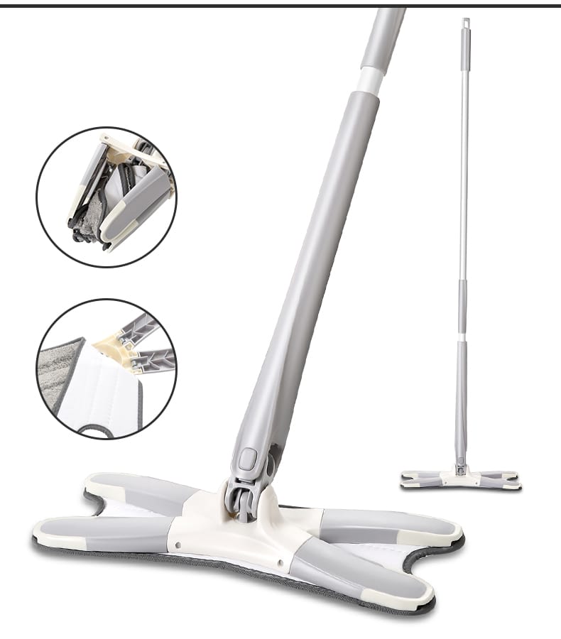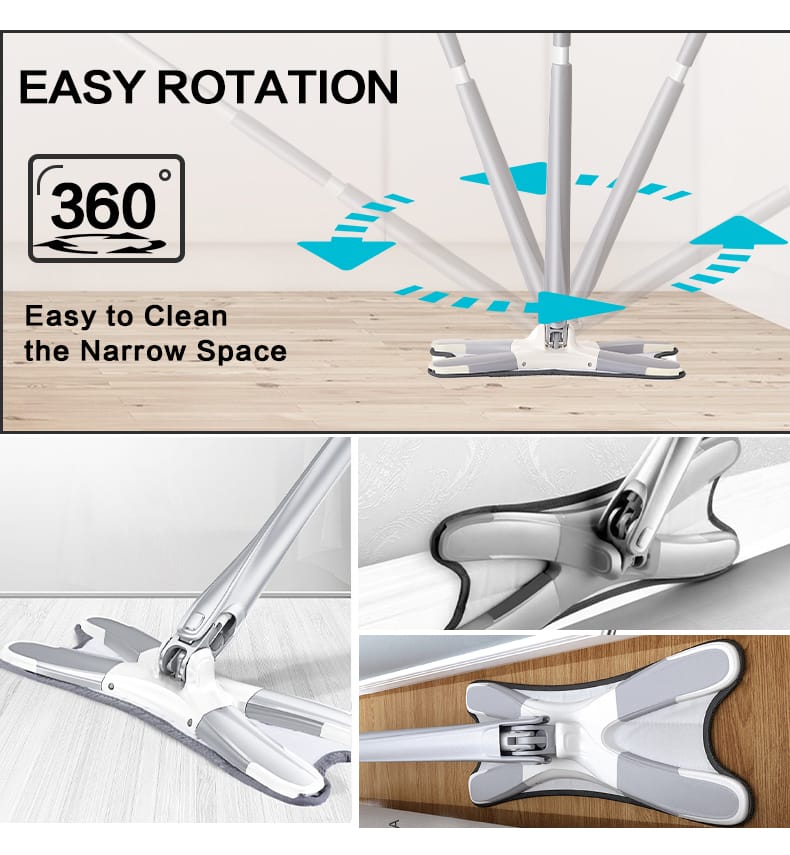 Hands-free washing: perform four-sided wringing with the simulated artificial Extra long 55 inch / 139.7 cm handle: Lightweight, easily extendable handle for cleaning hard-to-reach areas such as high corners, deep under the couch, furniture, windows, etc. Microfibre pads: Size: super absorbent microfibres that trap dust, spills and stains. Mop pads can be easily attached and removed from the mop head. Dry and wet mop: easy to lock in hair, dust, soil, water, oil, sauce and milk. Perfect for cleaning all types of floors including laminate, hardwood, tiles, vinyl, stone, concrete. 360° rotary head and X-shape design: Allows you to easily use microfibre mats to clean into corners, around furniture fe